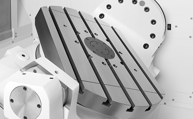 チルト・ロータリーテーブルは両端2点で支える構造を採用。B,C軸はローラギアカム駆動のためバックラッシがなく、高速・高精度・高剛性加工を実現します。