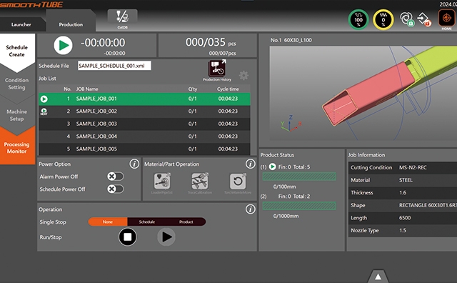 O sistema CNC SmoothTube tem uma nova interface gráfica de usuário especializada no processamento de tubos, o que garante uma operação mais fácil. Ele vem com um painel de toque duplo com tela grande de 21,5". A configuração da condição da operação programada pode ser alterada e o reprocessamento pode ser feito facilmente no sistema CNC. A configuração da tela auxilia os operadores em todo o processo de produção e a articulação do sistema suporta o processo eficiente de tubos.