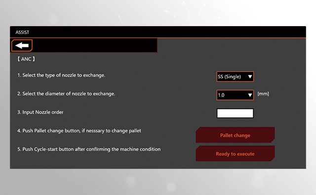 Ao simplesmente inserir os itens sugeridos pelas funções de assistência, o operador pode facilmente configurar funções como verificação do centro do bocal e troca automática do bico .