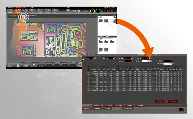 Todas as informações essenciais, como o banco de dados de condições de corte, estão acessíveis com apenas um toque na tela. A operação agora está ainda mais simples e eficiente.