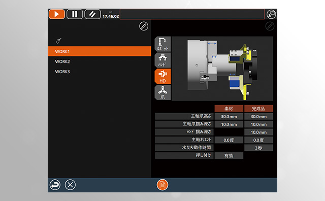 Vous pouvez créer des données d'opération, vérifier la progression du planning et l'état de l'opération sur l'écran d'affichage du panneau de commande CNC de la machine. L'utilisation d'un écran tactile permet une utilisation intuitive. De plus, vous pouvez visualiser l'état de fonctionnement sur votre ordinateur de bureau, votre tablette ou votre smartphone en vous connectant à Internet local.* *Un environnement Wi-Fi doit être préparé par le client.