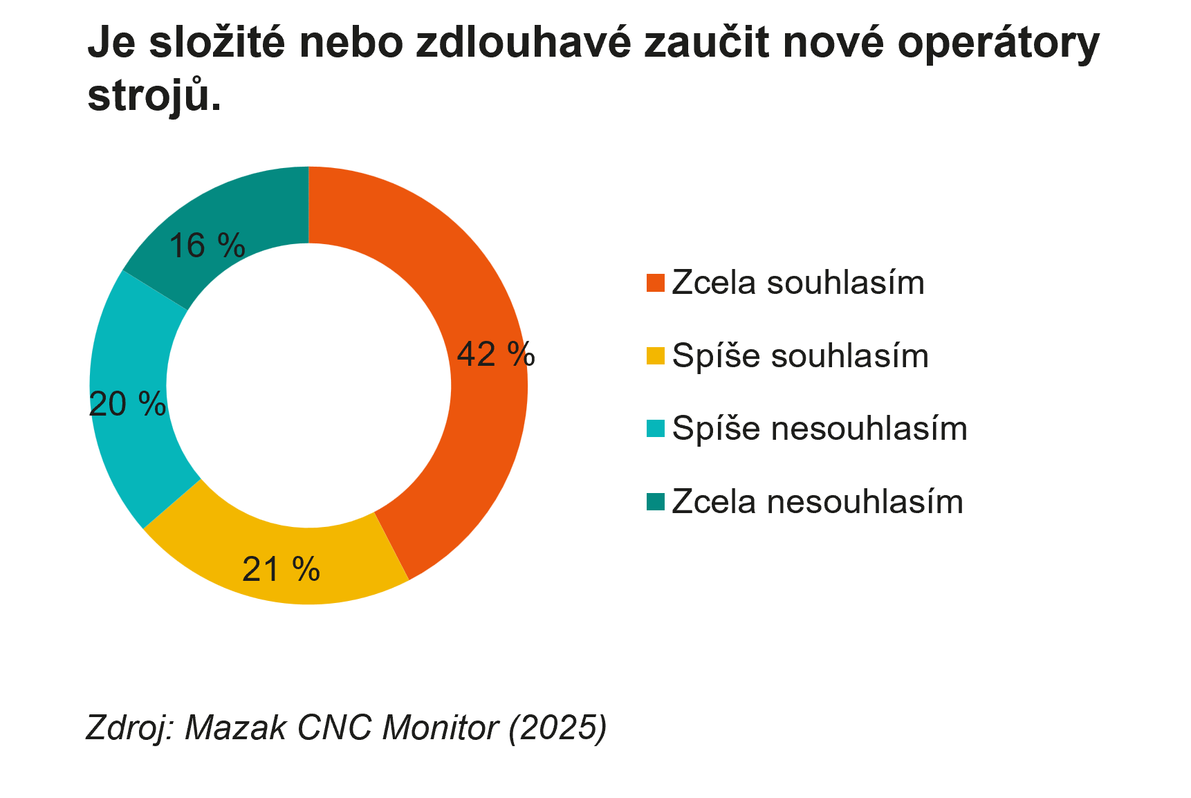 Ve dvou třetinách podniků (63 %) říkají, že naučit nového člověka pracovat se strojem je zdlouhavé – a čím je výroba složitější, tím déle trvá, než je nováček plně produktivní.