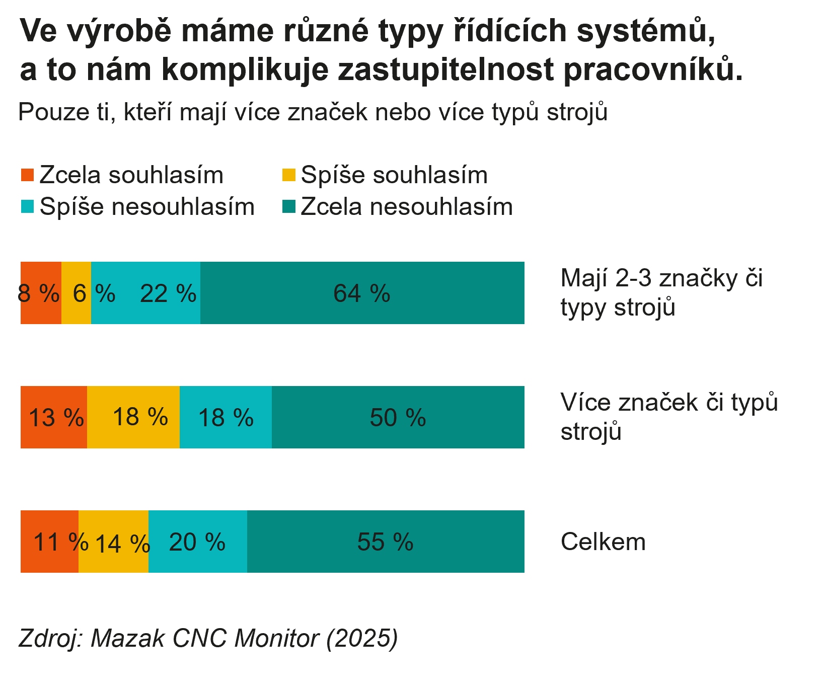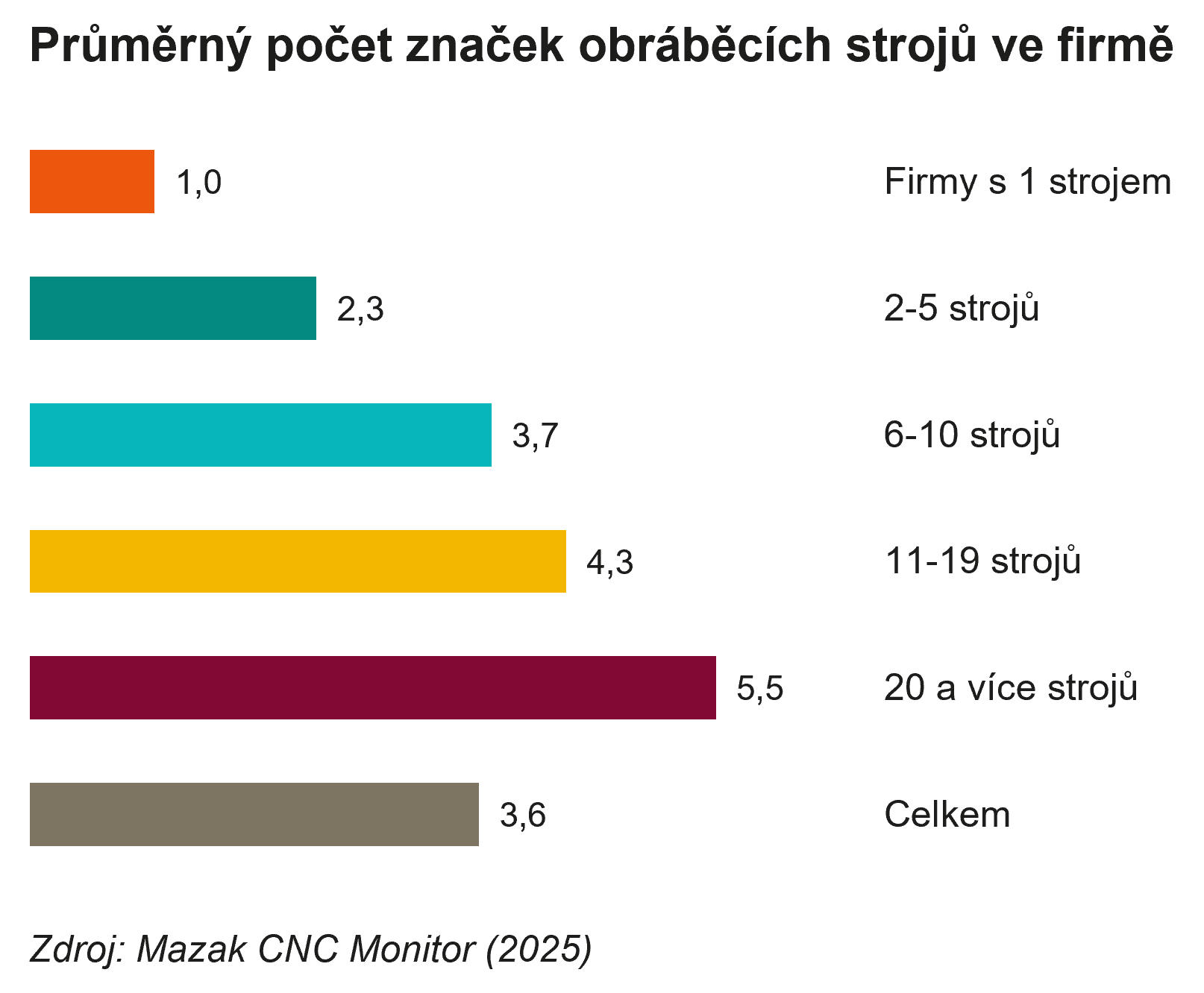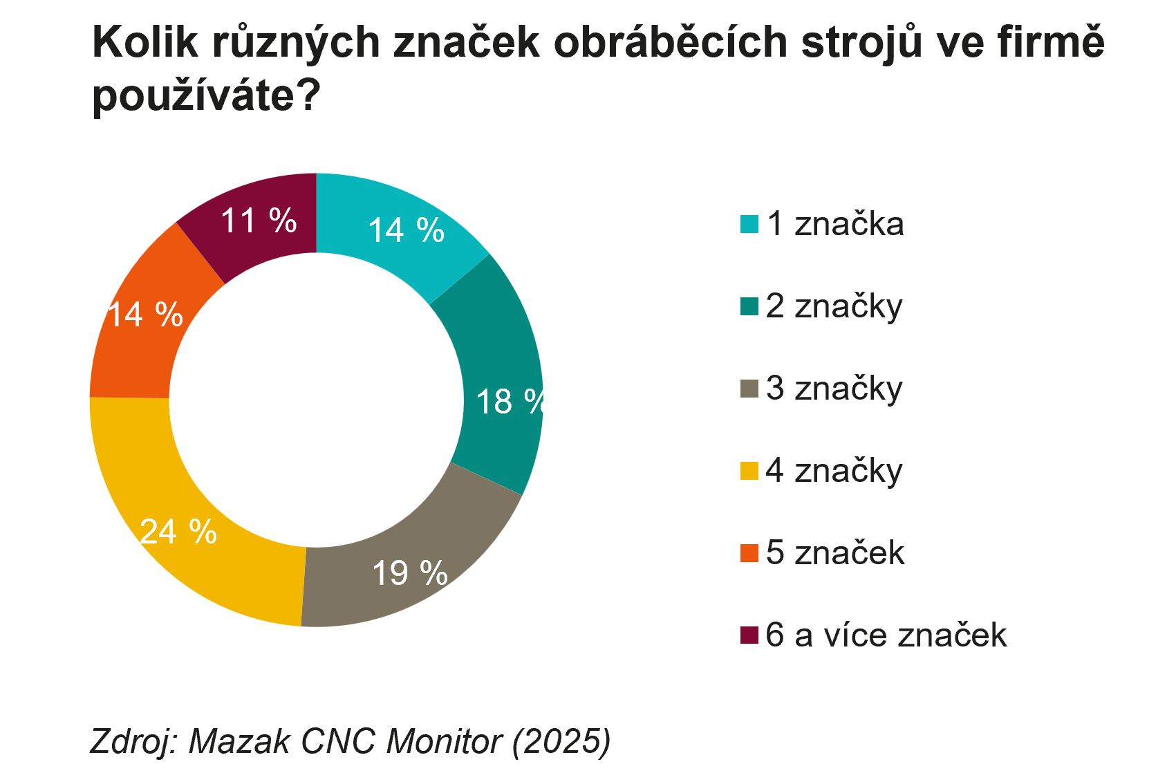 V průměru mají české a slovenské podniky 3 až 4 různé značky CNC strojů, přičemž u větších firem není výjimkou ani pět a víc. Pouze 14 % podniků používá stroje od jednoho výrobce.