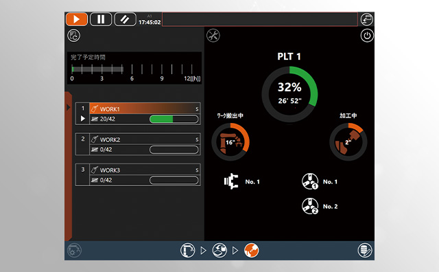 Simulace založené na skutečných strojních datech umožňují rychlou a snadnou optimalizaci provozních plánů systému předem. Kromě toho zobrazuje seznam nástrojů, které chybí pro automatický provoz, seznam nástrojů, které nebudou použity pro automatický provoz, a předpověď času a počtu obrobků, které budou dokončeny.