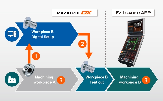 Il s’agit d’un système combiné de Ez LOADER 125i et de MAZATROL DX. Pendant l’usinage de la pièce A produite en série, une nouvelle pièce B peut être préparée à l’avance au bureau. En minimisant la configuration sur la machine, le travail et en maximisant le temps d’usinage, il est possible d’obtenir un fonctionnement très efficace.