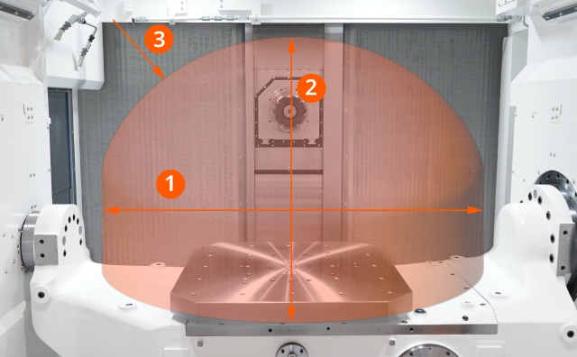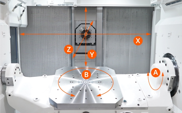 A két forgótengellyel (A- és B tengely) ellátott billenő-forgóasztallal szabadon változtathatja a munkadarab pozícióját, így beállításváltás nélkül teszi lehetővé a többoldali, folyamatos megmunkálást.