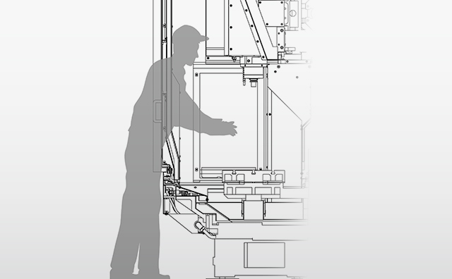 A munkadarab be- és kirakodása, a készülék cseréje, valamint az orsóban lévő szerszám ellenőrzése mind kényelmes testtartásban végezhető. A standard burkolathűtő-rendszer megakadályozza a forgács felhalmozódását, a középen elhelyezkedő forgácskihordó-szalag pedig közvetlenül az asztal alatt vezeti el a forgácsokat, ami csökkenti a kezelő munkaterhelését.