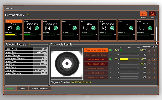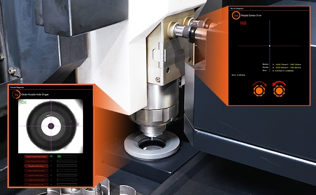 Az automatikus fúvókadiagnosztikai rendszer a kamera által rögzített képeket használja a fúvóka állapotának automatikus értékelésére és a fúvókaközéppont-eltérésének felismerésére. Ha a fúvóka sérültnek bizonyul, a rendszer automatikusan kicseréli egy tartalék fúvókára. Ha a fúvóka középpontjának helyzete eltolódott, a fúvóka középpontját az automatikus sugárközéppont-beállító funkció elvégzi a szükséges igazítást. A diagnosztika és a beállítás csökkenti a gépkezelők terhelését, és hozzájárul a termelékenység és a megmunkálási pontosság növeléséhez az automatikus működés közben.