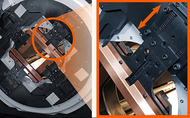 加工中に材料が曲がったりゆがんだりしないように4つのチャックが同期して軸移動・回転します。さまざまなサポータが振動を抑え、高精度な加工を実現します。