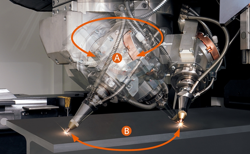 3 次元レーザヘッドによりさまざまな角度・方向から材料を加工します。丸、角パイプ材に加えて、L形、H形、I形、溝形などの形鋼の加工が可能です。