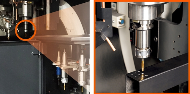 回転工具ユニット(オプション)を取り付けることで、ドリル・タップ加工が可能になります。ドリル加工、タップ加工、サーマルドリル加工、面取り加工に適した各種工具を装着することができ、ドリル加工時にワークを固定するサポート機能をオプションで搭載できます。タップ加工は最大M16、軟鋼では最大M20まで対応し、多様な加工ニーズに応えます。