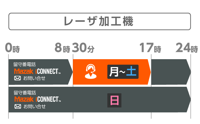 日曜日の0:00~8:00、月曜日の0:00~8:00の間は、Mazak iCONNECT™、留守番電話、お問い合わせフォームによる対応となります。