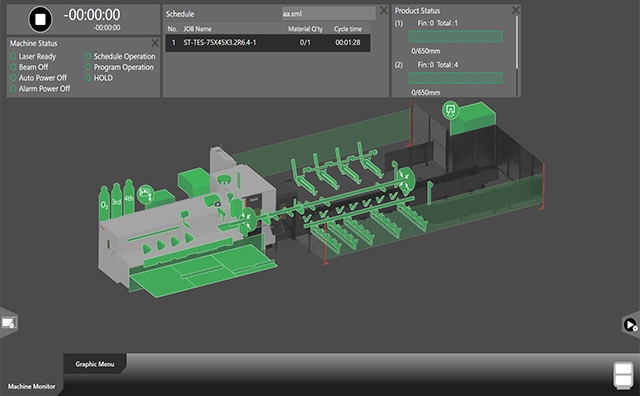 모니터는 3D 이미지와 함께 기계의 전체적인 상태를 제공하며, 문 열림/닫힘 상태를 포함한 중요한 상태 업데이트를 제공합니다. 그래픽 메뉴는 토치 및 기계 조작 메뉴에 쉽게 접근할 수 있도록 하여 작업자를 지원합니다. 또한 기계의 공정 진행 상태가 표시됩니다.
