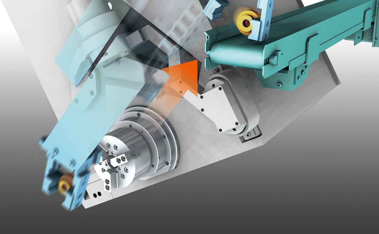 Górna i dolna głowica rewolwerowa są ustawione w linii prostej, w kierunku osi X. Dzięki synchronizacji obróbki za pomocą obu głowic rewolwerowych można realizować obróbkę „balanced cutting”, która minimalizuje przemieszczenie detalu. Do skrócenia cyklu roboczego przyczynia się także możliwość jednoczesnego toczenia detalu lewego/prawego.