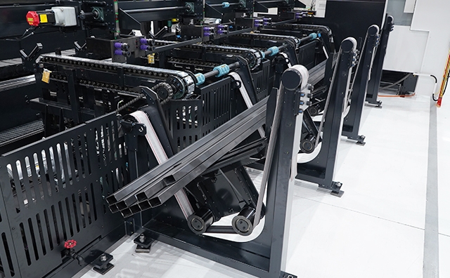 透過將大量管材綑束成組的整綑上料器,自動搬入素材,