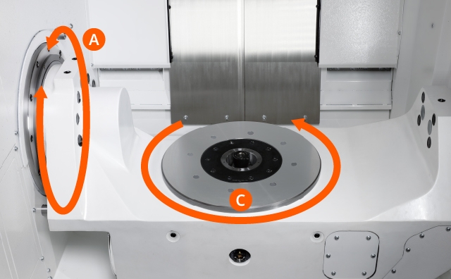 工作台採用A軸兩側兩點支撐構造設計,確保了極高的剛性並實現高精度加工。A軸與C軸皆能以0.0001°進行分度,可進行複雜多面加工及5軸加工。